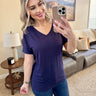 Fall in love with your basics again in this navy Chloe Cozy Tee. Featuring a flattering v-neckline, extended short sleeves, and a slight dolman cut, this relaxed yet feminine top is sure to become a staple in your wardrobe.