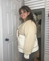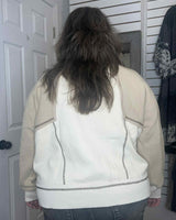 FEATURES: HEART SHAPED FOOTBALL PATCH. RAW EDGE DESIGN, STRAIGHT HEMLINE, WITH ASMETRICAL CUTS. RIBBED CUFFED LONG SLEEVE, RIBBED TRIM ON NECK AND BOTTOM HEM. HAS POCKETS!!!