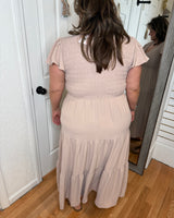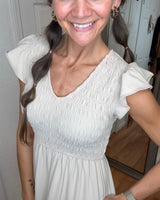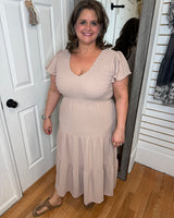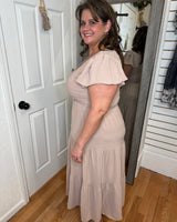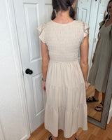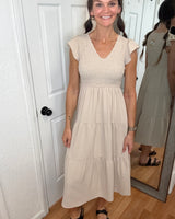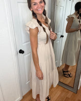Expertly crafted with a smocked top, the Kennedy Flutter Sleeve Midi Dress in khaki by Blu Pepper exudes effortless elegance. The flutter sleeves add a charming touch to this versatile midi dress, making it perfect for any occasion.
