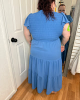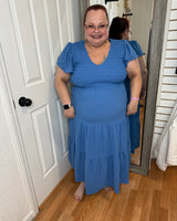 Expertly crafted with a smocked top, the Kennedy Flutter Sleeve Midi Dress in Dusty Blue by Blu Pepper exudes effortless elegance. The flutter sleeves add a charming touch to this versatile midi dress, making it perfect for any occasion.