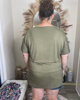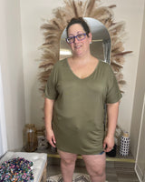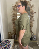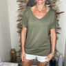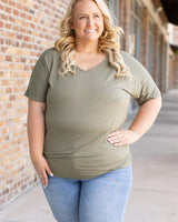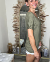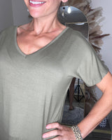 This top features a flattering V-neckline, complemented by longer short sleeves and a stylish dolman cut, providing a relaxed yet distinctly feminine fit. The blend of 95% rayon and 5% spandex ensures a flexible, soft feel, perfect for your everyday wear.