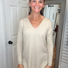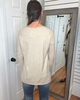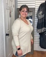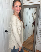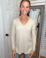 FEATURES: LONG SLEEVE V-NECK, DROP SHOUDER, TAPERED ARM FIT, SIDE SLITS