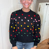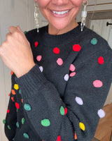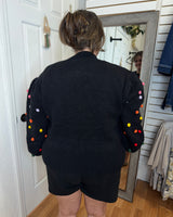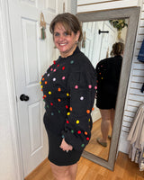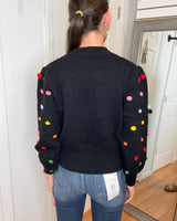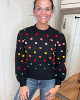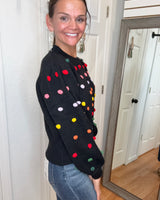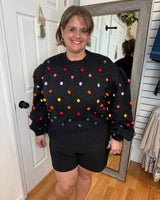 FEATURES: BLACK BACKGROUN WITH COLORFUL POM DETAILS. RIBBED CUFFED HEM, WRIST, AND CREW NECK.