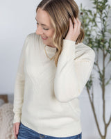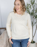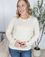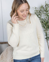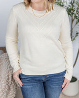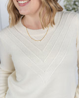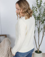 Add a touch of cuteness to your wardrobe with the Evelyn Sweater in Ivory. Featuring a subtle yet charming design on the neckline that extends to the shoulder, this sweater will make you feel happy and stylish. Perfect for any occasion, the Evelyn Sweater effortlessly combines fashion and comfort.