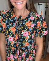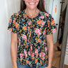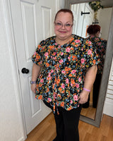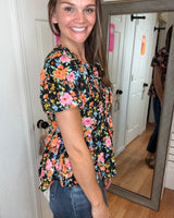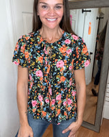 -Floral Woven Blouse W/ Front Ribbon Bow Ties, and short bubble sleeve