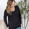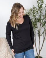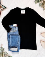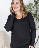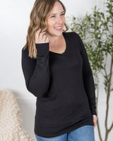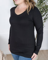 Meet the Larissa Long Sleeve Top in classic black. A staple V-neck that combines all-day comfort with versatile style, allowing you to effortlessly transition from a casual daytime look to an elevated evening ensemble.