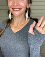 The Leah Long Sleeve Top in green adds a pop of color to your wardrobe. With its classic design and comfortable fabric, this top is perfect for transitioning through the seasons. Pair it with jeans or leggings for a stylish, laid-back look. Magic thuymbholes at the wrist.