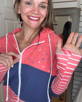Be bold and make a statement with our Colorblock Full zip Hoodie! Featuring a trendy color block design with stars, navy, and stripes This hoodie is perfect for the holiday! Made with stretchy fabric for ultimate comfort, this hoodie will keep you looking stylish and feeling confident all season long.