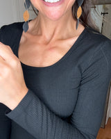 The Nina Long Sleeve Top in black by MIKAROSE offers a flattering ribbed texture and a comfortable scoop neck design. Its long sleeves provide cozy coverage, making it perfect for layering or wearing on its own. This versatile top combines style and comfort, supporting your everyday wardrobe with ease and elegance.