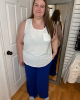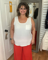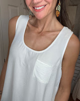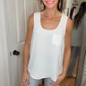 Introducing the MARA Sleeveless Blouse in Ivory by MITTOSHOP. Crafted from a lightweight, breathable fabric, this blouse is perfect for warmer days. Featuring a convenient front pocket, it combines style and practicality. Stay cool and comfortable in this must-have addition to your wardrobe.