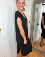 FEATURES: SEAMLESS CAP SLEEVE, ROUNDED NECK, DOUBLE SIDE SLITS, POCKETS