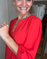 FEATURES: 3/4 puff shoulder sleeve, with elastic cuff. split vneck, with front pleat , rounded hemline
