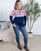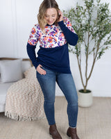 Meet Natalie! She's both sweet and sophisticated, while also being cute and cozy! This is made with your favorite triple stretch fabric in the navy and the soft cozy fabric (same as our soft funnel neck) in the abstract print. A lightweight pullover that is fall perfection!