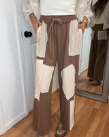 Experience comfort and style with the ODDI patchwork wide-leg pants. Designed with a drawstring waist for an adjustable fit, these pants combine textured knits and delicate floral panels, offering a unique and breathable wear. Perfect for relaxed days, they blend casual ease with artistic details to support your everyday confidence.