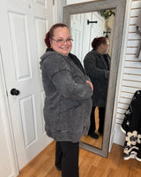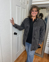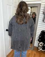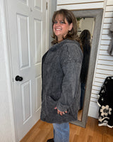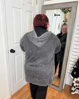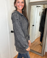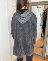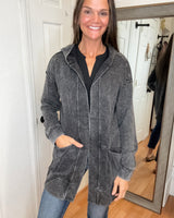 FEATURES: HOODED OPEN FRONT CARDIGAN, WITH DEEP FRONT POCKETS. DROP SHOULDER, MID LENGTH, COVERS THE BUM. WASHED BLACK IN COLOR