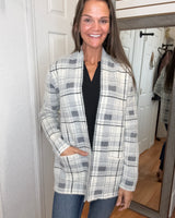 FEATURES: LONG SLEEVE OPEN FRONT CARDIGAN. GREY, IVORY, AND BLACK PLAID. FRONT PATCH POCKETS. JUST COVERS THE BUM LENGTH.