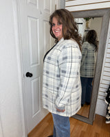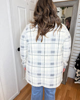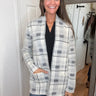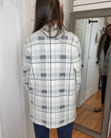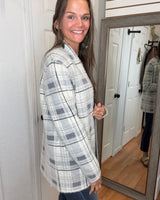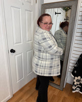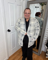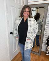 Experience cozy elegance with the Griselda open-front staccato jacket in a soft ivory and grey plaid pattern. Its fluffy texture offers warmth and comfort, making it perfect for layering on chillier days. The open front design provides easy wearability and a relaxed fit that complements any casual or chic outfit effortlessly.