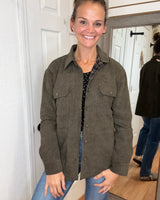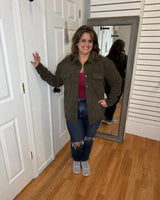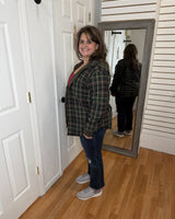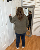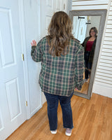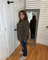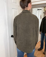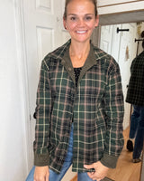 FEATURES: REVERSIBLE OLIVE GREEB RIBBED LIKE FABRIC, OR PLAID COTTON FABRIC. TWO LOOKS IN ONE WITH THIS JACKET !! BUTTON CUFFED WRISTS, FUNCTIONAL BUTTONS ON FRONT , FUNCTIONAL BUTTON FRONT CHEST POCKETS, COLLARED. ROUNDED HEMLINE.