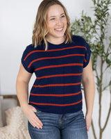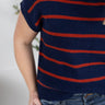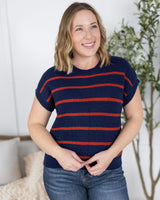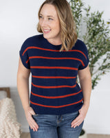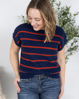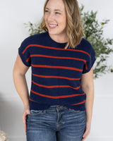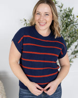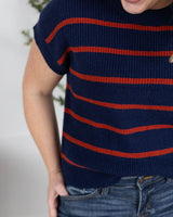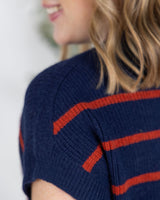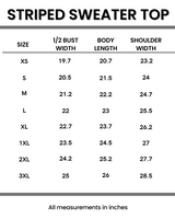 Get cozy this fall with our Striped Sweater Top. Made with a soft fabric and featuring a round neckline, it's perfect for pairing with jeans or dress pants. Stay stylish and comfortable all season long with this must-have piece in classic navy and pumpkin stripes.