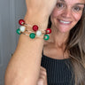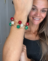 3 SEPARATE STRETCH BRACELETS. RED, GREEN AND PEARL COLORED WITH GOLD.