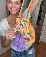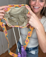PATTERNED CROSSBODY BUCKET BAG W/ TASSELED DRAWSTRING
