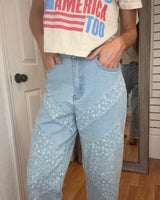 FEATURES: HIGH RISE, WIDE LEG CROP BAGGY FIT, WITH A DIAGNAL FLORAL PATHWAY PRINT, WITH RAW HEM. STRETCHY ELASTIC BACK WAIST BAND, WITH BUTTON AND ZIPPER FRONT.