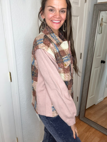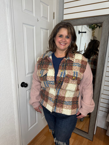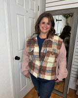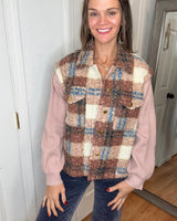 Elevate your layering game with this mixed media plaid faux fur cropped jacket. Featuring a cozy sweater sleeve construction paired with luxe faux fur accents, this piece strikes the perfect balance between comfort and style. The button-down front and functional pockets add practical charm, while the boxy silhouette flatters every frame. Perfect for transitional weather, this cropped jacket works beautifully over your favorite tees, dresses, or sweaters. You've got this—make it your go-to piece for effortless, trendy looks.