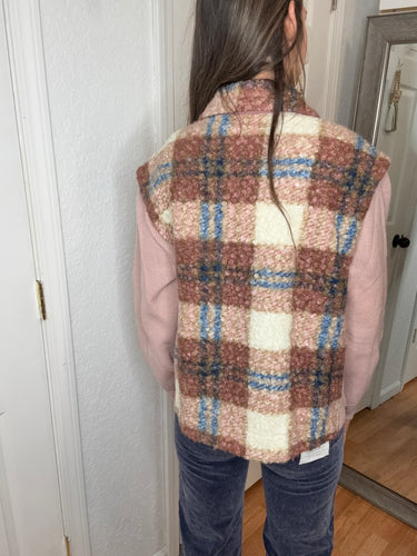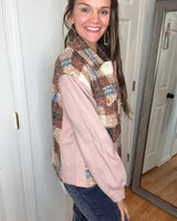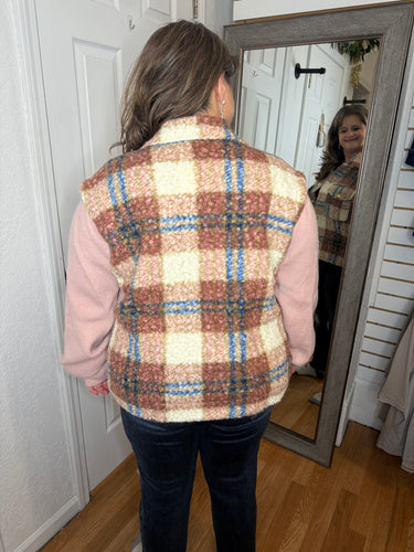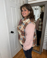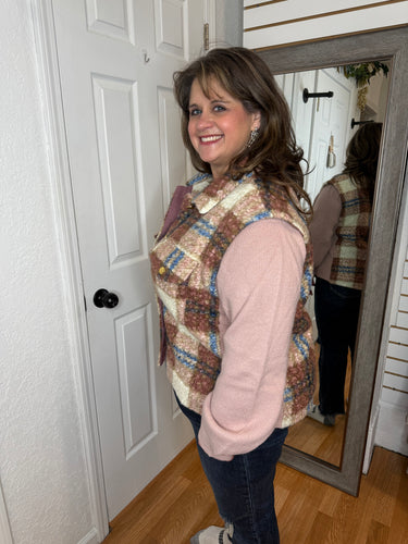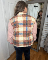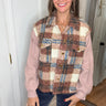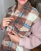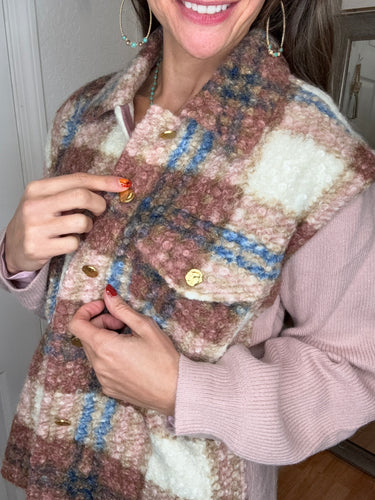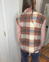 FEATURES: MOM CROP LENGTH, BOXY PLAID SHACKET. TAB FRONT BUTTONS, FUNCTIONAL CHEST POCKETS, DROP SHOULDER. RIBBED CUFFED SLEEVES. FOE EASY ROLLING UP. FEATURES THE COLORS: ROSE PINK, MAUVE, NAVY BLUE, IVORY, TAN.
