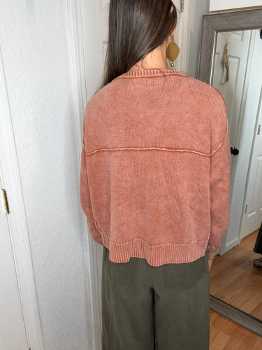 FEATURES: LONG SLEEVE, BUTTON DOWN CARDIGAN. EXPOSEED, RAW SEAMS, DROP SHOULDER, RIBBED TRIM, RIBBED CUFFED WRIST.