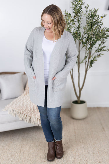 Conquer your day with the Layla Sweater Cardigan in Grey. This open-front cardigan features two pockets, perfect for carrying your essentials on the go. Its grey color adds a touch of sophistication while keeping you cozy and stylish. Take on any adventure with this versatile and practical piece!