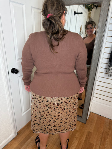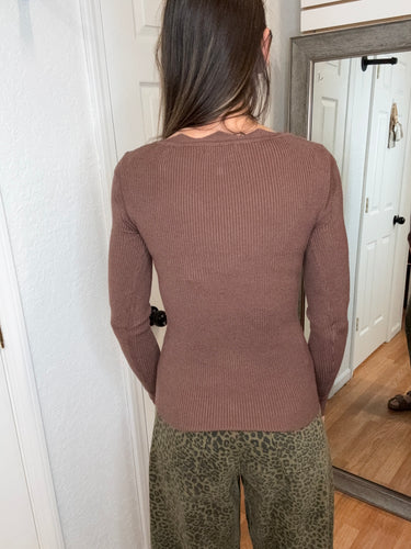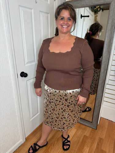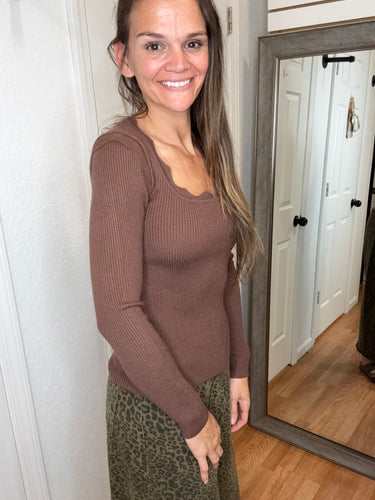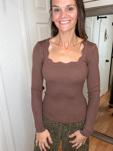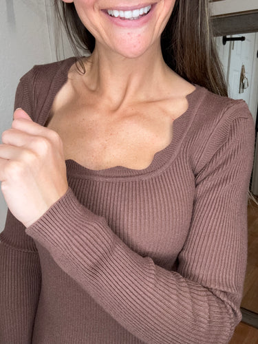 SABLE SCALLOPED LONG SLEEVE SWEATER TOP COCOA- MIKAROSE