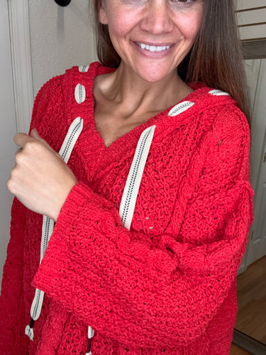 This red chenille pullover combines cozy softness with a relaxed, roomy fit for all-day comfort. Featuring a flattering v-neck hoodie and long sleeves, its tie detail adds a stylish touch to this casual essential. Perfect for layering or wearing on its own, it’s designed to keep you comfortable and effortlessly chic.