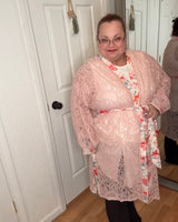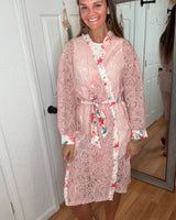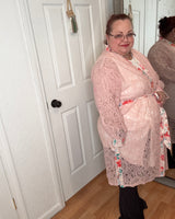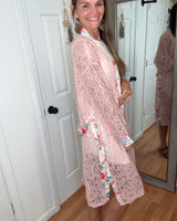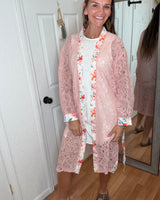 Elevate your wardrobe with the Willow Lace Long Sleeve Cover Up Top in soft pink. This delicate duster features intricate lace detailing and a charming floral trim, offering a graceful layer that enhances any outfit. Its long sleeves provide gentle coverage while maintaining a light, breathable feel—perfect for adding a touch of elegance and comfort throughout your day. Whether layered over casual or dressy looks, this piece supports your style with effortless sophistication.
