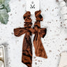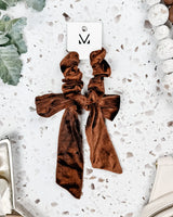 4 Upgrade your hair game with our Velvet Bow Scrunchie! Made with soft velvet material, this scrunchie adds a touch of elegance to any hairstyle. So go ahead, tie your hair up in style and let our scrunchie do the talking. (Hair tie-ing never looked so good!)