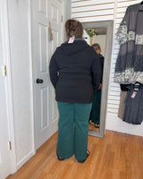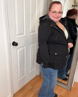 FEATURES: BUTTON AND ZIP FRONT CLOSURE, FAUX ZIPPER POCKETS ON BOTH BREASTS, FRONT CARGO STYLE FUNCTIONAL POCKETS, INSIDE TIE FOR CINCHING IF DESIRED. HOOD WITH FUNCTIONAL TIES, AND SHOULDER PURSE HOLDING BUTTON STRAP.
