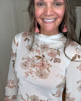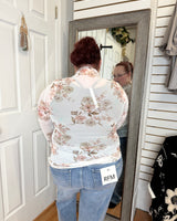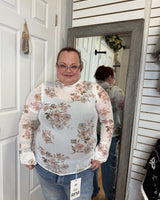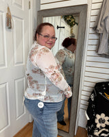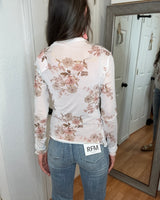 FEATURES: Long sleeve mesh sheer top. Off white with earth tone florals. ROUCHING AT THE ARM AND ONE SIDE OF WAIST.