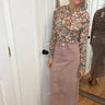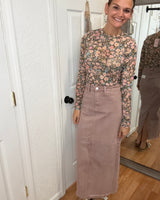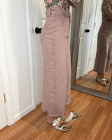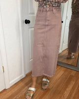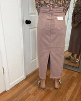 DENIM MIDI/MAXI SKIRT WITH BACK SLIT, RAW EDGE, AND MAUVE IN COLOR. FUNCTIONAL BACK POCKETS.