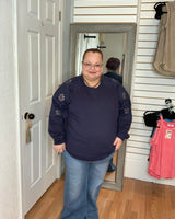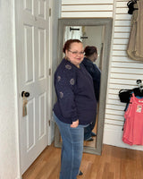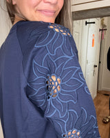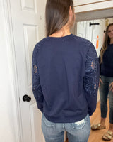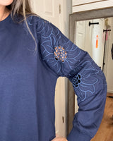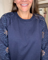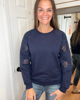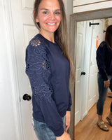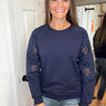 Stay comfortable and stylish with the Beth Cut Out Sleeve Pullover Sweatshirt in NAVY. Featuring a unique flower cut-out design on the long sleeves, this top adds a delicate touch to your casual wardrobe. Its soft fabric ensures all-day comfort, making it perfect for relaxed days or layering in cooler weather. Embrace effortless style with this versatile sweatshirt that supports your everyday look.