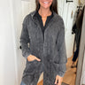 FEATURES: HOODED OPEN FRONT CARDIGAN, WITH DEEP FRONT POCKETS. DROP SHOULDER, MID LENGTH, COVERS THE BUM. WASHED BLACK IN COLOR