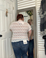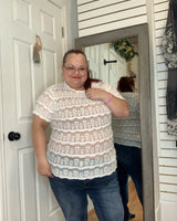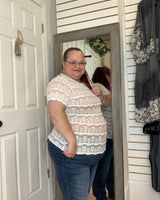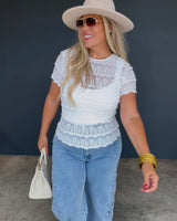 Super cute for layering, Feminine and flattering, this lace top features a sheer stretchy layered lace bodice sleeves and back. The fitted silhouette hugs in all the right places while still offering comfort and movement. Perfect for dressing up denim or layering under jackets — sweet, soft, and so versatile.