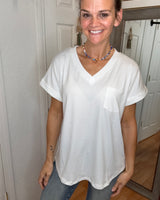 FIT: RELAXED , TRUE TO SIZE POCKET TEE. V NECK, TACKED SLEEVE, ROUNDED HEMLINE