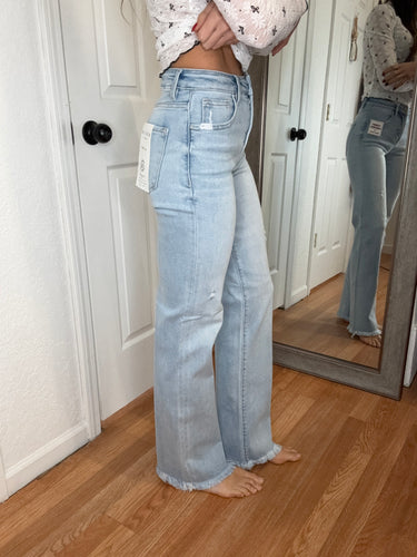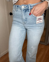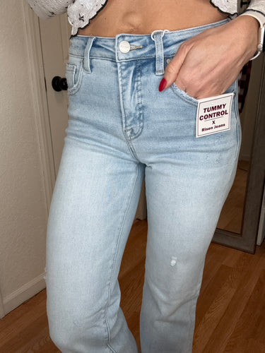 FEATURES: TUMMY CONTROL PANEL, HIGH RISE LONG STRAIGHT LEG JEANS, WITH RAE FRAYED HEM.