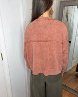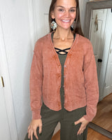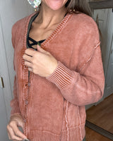 FEATURES: LONG SLEEVE, BUTTON DOWN CARDIGAN. EXPOSEED, RAW SEAMS, DROP SHOULDER, RIBBED TRIM, RIBBED CUFFED WRIST.