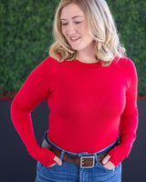 Effortlessly blend style and comfort with this new long sleeve top. Designed with stretchy fabric, a fitted silhouette, added thumbholes and it features a high neck line for a chic touch. You can also tuck it in for a faux bodysuit look.