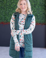 Effortlessly blend style and comfort with this new long sleeve top. Designed with stretchy fabric, a fitted silhouette, added thumbholes and it features a high neck line for a chic touch. You can also tuck it in for a faux bodysuit look.