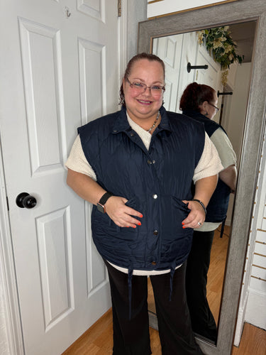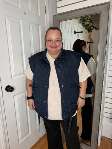 FEATURES: DECORATIVE TIE BOWS ON POCKETS. HIP LENGTH NAVY BLUE PUFFER STYLE LAYERING VEST. SNAP FRONT BUTTONS, FRONT PATCH POCKETS. CINCH TIE WAIST.