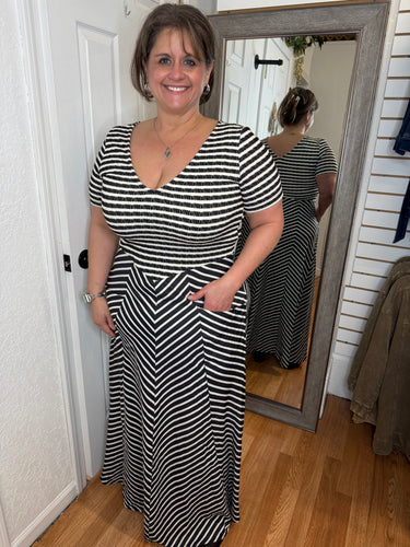 Prepare to fall in love!  Features a stretchy knit bodice with a flattering deep V neckline. Skirt is a contrast fabric A-line style with angled stripe detailing and oversized side pockets. Skirt has slight stretch also. Effortless, comfortable, and made for any day!