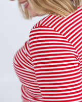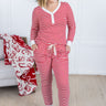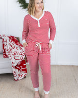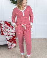 Snuggle up in festive style with our Candy Cane Pajama Set! This playful sleepwear features classic holiday stripes, a henley button top with white cuffs, and jogger bottoms with pockets and a silky drawstring. The stretchy waistband ensures comfort while you deck the halls or dream of sugar plums!