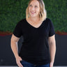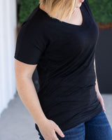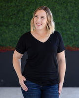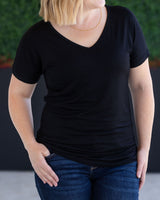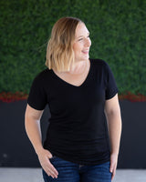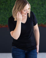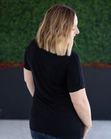 Fall in love with your basics again in this classic black Chloe Cozy Tee. Featuring a flattering v-neckline, extended short sleeves, and a slight dolman cut, this relaxed yet feminine top is sure to become a staple in your wardrobe.