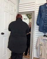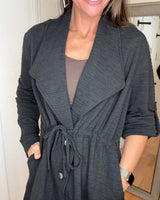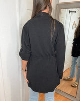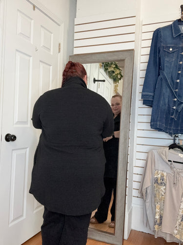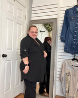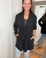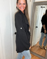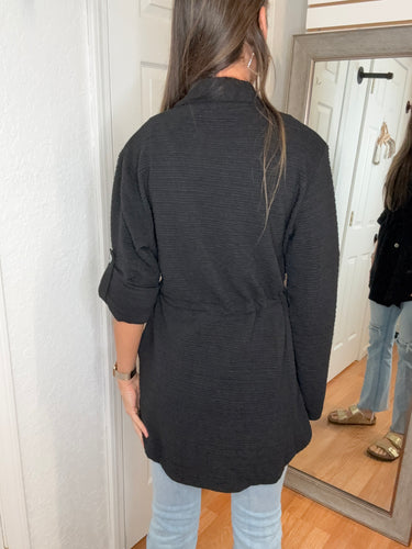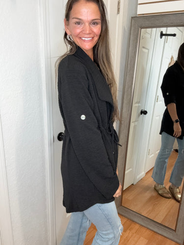 FEATURES: BLACK TEXTURED LAYERING JACKET, WITH POCKETS. FEATURES A LONG SLEEVE WITH TAB SLEEVES FOR EASY SHORTNENING. OPTIONAL CINCH & TIE WAIST, 2 FUNCTIONAL BUTTONS, AND A LAPEL. ROUNDED HEMLINE. AVERAGE TO LONGER LENGTH. OFFERS FULL FRONT AND BUTT COVERAGE.